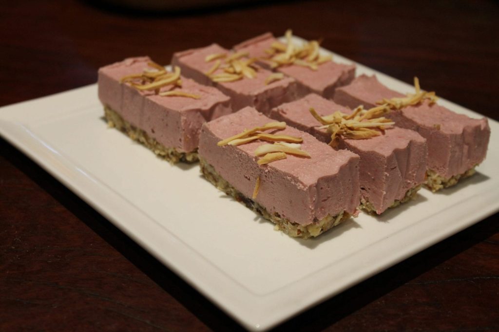 Place all base ingredients into food processor, and process until a course crumbly mixture forms. Transfer to a loaf pan lined with baking paper. Push ingredients down evenly and place in fridge or freezer to set.