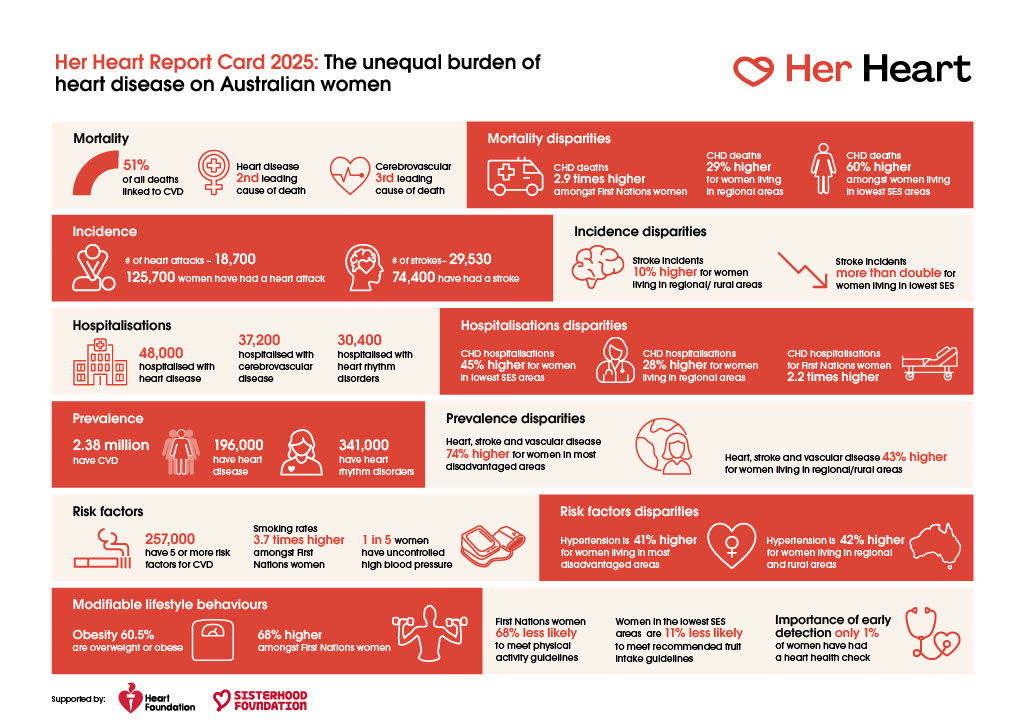 The Her Heart Report Card brings together data on inequities between groups of women, showing where gaps exist and where action is most urgently needed. This resource supports clinicians, researchers, policymakers, and health advocates in planning services, shaping investment, and strengthening prevention for women across Australia.