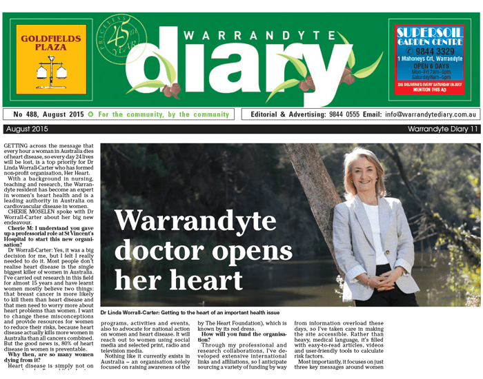 With a background in nursing, teaching and research, the Warrandyte resident has become an expert in women’s heart health and is a leading authority in Australia on cardiovascular disease in women.